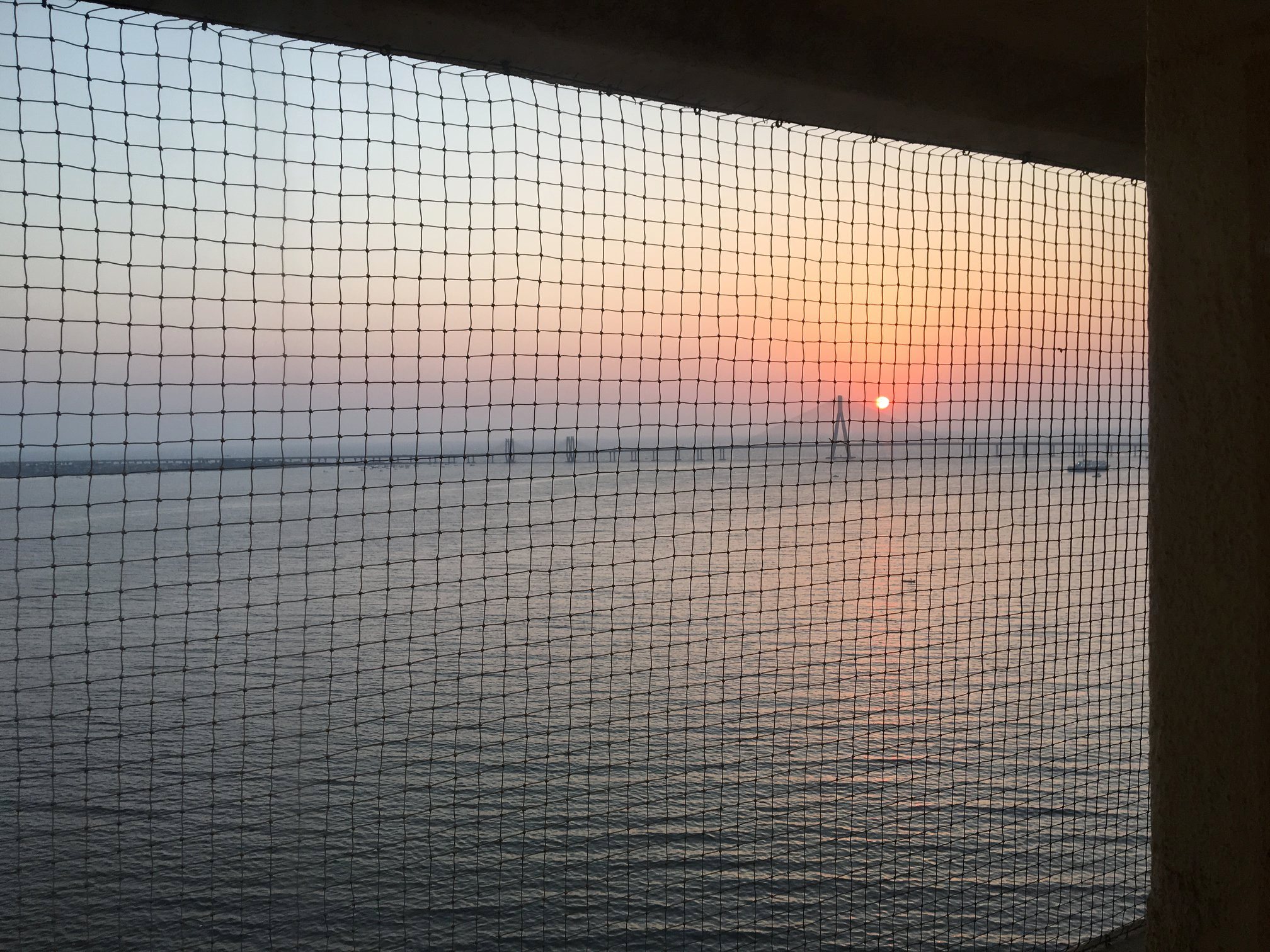 8th April-View of the sunset on day 1 from the hospital room. The net is to prevent birds from sitting on the parapet.